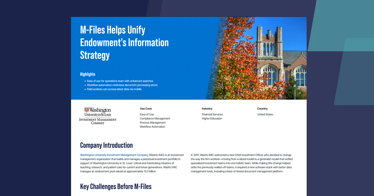 Wealth Management Featured Content Context-First Document Management Optimize Energy Operations with AI Info Management Deep Analysis Vendor Vignette Hood Sweeney Securities Client Information Management: Delivering Speed, Accuracy, and Value for Insurance Enhancing Information Management Unlocking the Value of Knowledge Work Digital Transformation: The Future of Work Shaping the future of work with M-Files & Microsoft – Jaime De Mora, Microsoft CTO Enhance Your Digital Experience with M-Files & Microsoft Copilot M-Files Showcases M365 Enhancements for AIIM Demo Days The Smarter Way To Work With M-Files Empower your organization with the M-files Connector for Copilot Unleash the power of our AI assistant, M-Files Aino Family Office – Anonymous Curated, connected, and compliant: 3 ways financial services can use knowledge work automation to focus on client value and productivity Enabling Knowledge Workers with AI White paper: Unlocking the Power of Generative AI with Microsoft 365 Washington University Investment Management Company Enabling Knowledge Workers with AI FVCbank Using Knowledge as a Competitive Advantage: Capturing and Leveraging Intellectual Capital Finnfund Unlocking the value of Knowledge Work Automation Valeo Financial Advisors Collaborate, Increase Productivity & Efficiency in a World of Content Chaos Valeo Financial Advisors Document Automation: Scaling New Heights in Legal Efficiency Natsure M-Files Hubshare: Seamless and Simplified Content Collaboration Decoding Document Automation 10 Ways Financial Services Companies Are Using Intelligent Information Management to Drive Digital Transformation M-Files Ment – Clause Library Federal Realty Property Management Discover why our customers love M-Files Ment Secure Information Management Strategies in the Hybrid Enterprise Stearns Bank Himmelwright, Huguley & Boles Stearns Bank Austbrokers Countrywide Vista Bank Krogius eQ Asset Management Bridges Trust Silta Oy (English subtitles) Stearns Bank 3 Ways Firms are Winning New Business & Enhancing their Reputation with IIM Valeo Financial Advisors HORNE LLP How Legacy Technology is Delaying the Transition to Hybrid Working in Europe