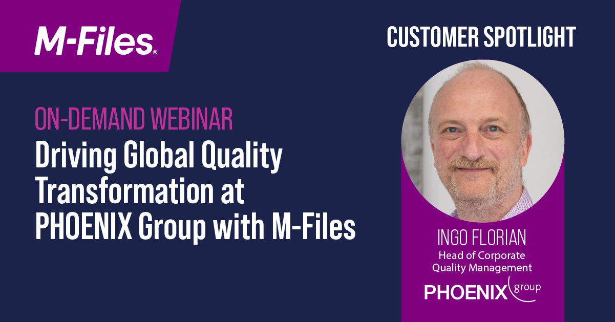Scientific Research Context-First Document Management Architected for AI: A Strategic Guide to Modern Document Management Build a Stronger Business with Risk and Compliance Management Technology Record Issue 38 eBook Download 2025 QMS Buyer’s Guide | Choose Quality Management Software The Stroke Association Trelleborg Sealing Solutions Kalmar AB Quality Management: Boost Operational Performance through Quality Management Local Health Authorities Analytical Committee (LHAAC) Enterprise Asset Management: Empowering Organizations with Enterprise Asset Management Why Knowledge Work Automation Unlocks Manufacturing Excellence Navigating Security and Compliance Obstacles with M-Files Solving Information Chaos with AI – See M-Files Featured in Technology Record PHOENIX Group Customer Spotlight: Driving Global Quality Transformation at PHOENIX Group with M-Files Hafslund Celsio Enabling Knowledge Workers with AI White paper: Unlocking the Power of Generative AI with Microsoft 365 Enabling Knowledge Workers with AI Elomatic Using Knowledge as a Competitive Advantage: Capturing and Leveraging Intellectual Capital Unlocking the value of Knowledge Work Automation Roal Manzil Healthcare Services Pediatric Home Service Insurance Company IDA Foundation