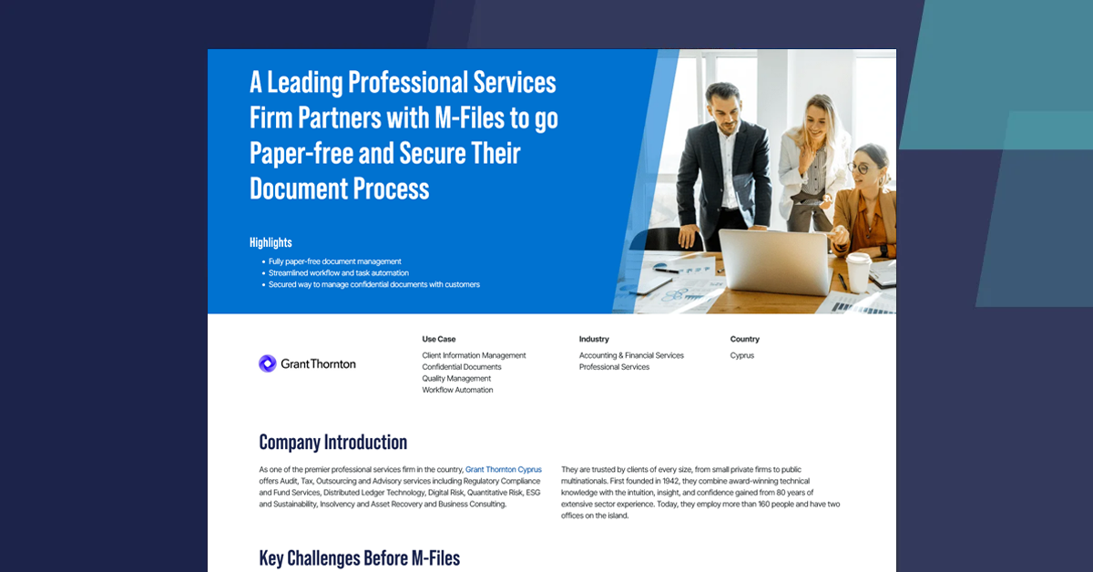 Accounting, Tax and Audit Context-First Document Management CROP Project Information Management: Optimize Project Success With Project Information Management Optimize Energy Operations with AI Info Management Why Knowledge Work Automation Unlocks Manufacturing Excellence Navigating Security and Compliance Obstacles with M-Files Deep Analysis Vendor Vignette How Can Automation & AI Help You Deliver Speed, Accuracy & Value For Your Clients & Firm? Hood Sweeney Securities Client Information Management: Delivering Speed, Accuracy, and Value for Insurance Enhancing Information Management Unlocking the Value of Knowledge Work Digital Transformation: The Future of Work Shaping the future of work with M-Files & Microsoft – Jaime De Mora, Microsoft CTO Enhance Your Digital Experience with M-Files & Microsoft Copilot PKF Francis Clark M-Files Showcases M365 Enhancements for AIIM Demo Days The Smarter Way To Work With M-Files Empower your organization with the M-files Connector for Copilot Unleash the power of our AI assistant, M-Files Aino Family Office – Anonymous Accounting and AI: A successful partnership Grant Thornton Cyprus Curated, connected, and compliant: 3 ways financial services can use knowledge work automation to focus on client value and productivity Enabling Knowledge Workers with AI White paper: Unlocking the Power of Generative AI with Microsoft 365 Enabling Knowledge Workers with AI