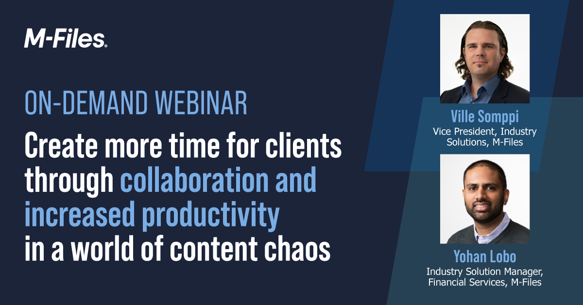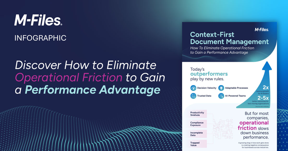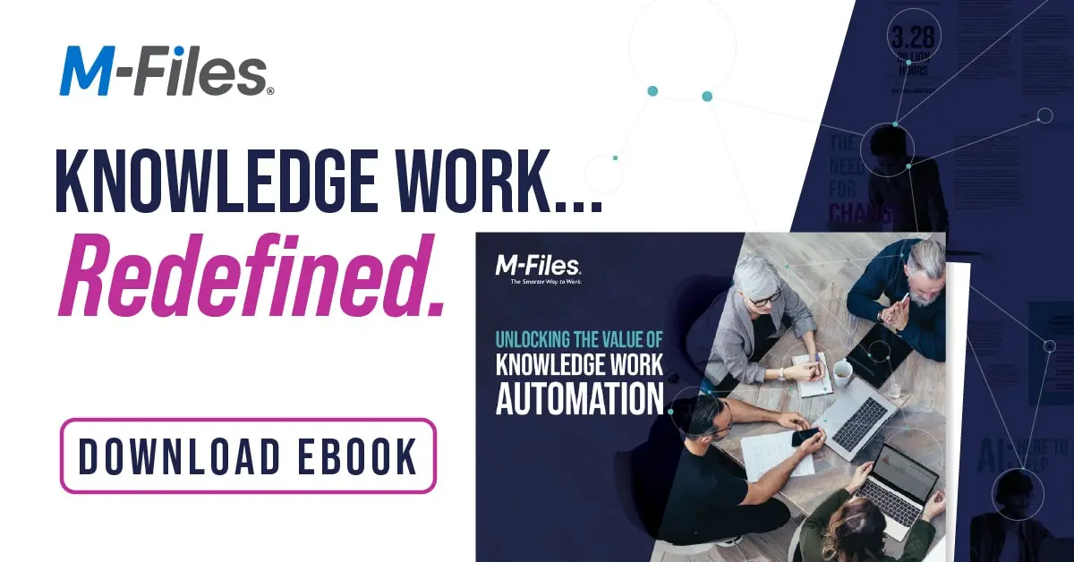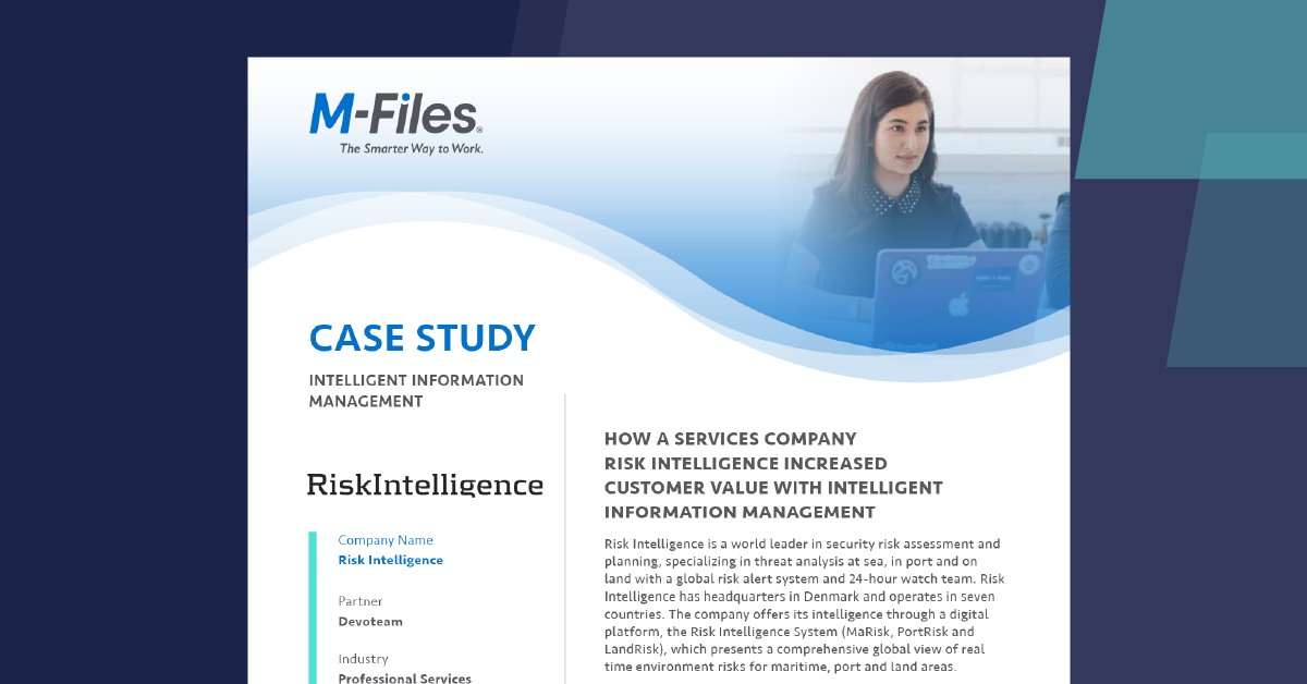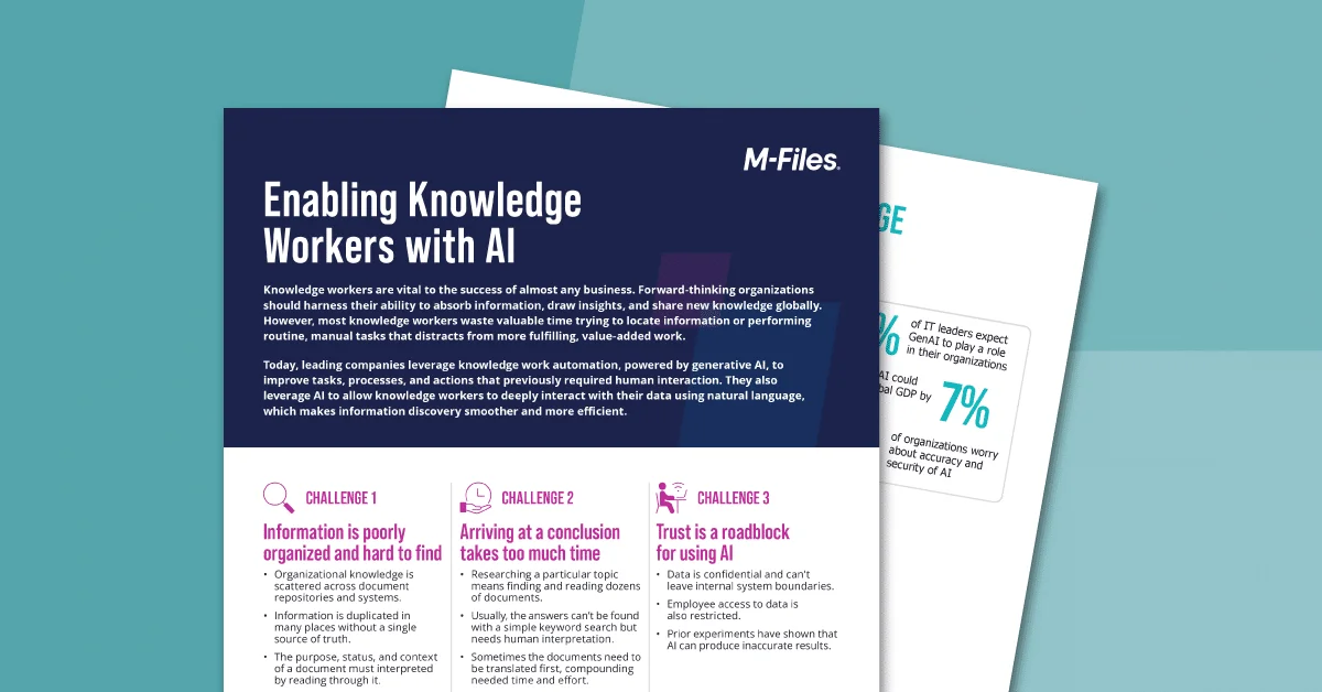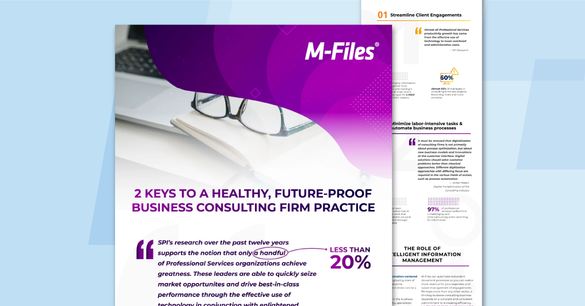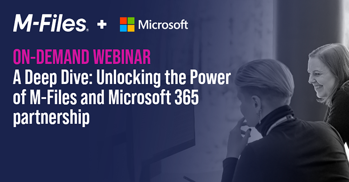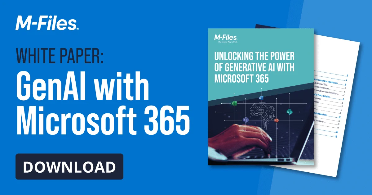 Consulting Context-First Document Management Webinar | A Deep Dive: Unlocking the Power of M-Files and Microsoft 365 partnership Shaping the future of work with M-Files & Microsoft – Jaime De Mora, Microsoft CTO Enhance Your Digital Experience with M-Files & Microsoft Copilot PKF Francis Clark M-Files Showcases M365 Enhancements for AIIM Demo Days The Smarter Way To Work With M-Files Empower your organization with the M-files Connector for Copilot Unleash the power of our AI assistant, M-Files Aino Enabling Knowledge Workers with AI White paper: Unlocking the Power of Generative AI with Microsoft 365 Enabling Knowledge Workers with AI Using Knowledge as a Competitive Advantage: Capturing and Leveraging Intellectual Capital Unlocking the value of Knowledge Work Automation Collaborate, Increase Productivity & Efficiency in a World of Content Chaos Document Automation: Scaling New Heights in Legal Efficiency vem.die arbeitgeber M-Files Hubshare: Seamless and Simplified Content Collaboration Crowe UK Decoding Document Automation M-Files Ment – Clause Library Discover why our customers love M-Files Ment Secure Information Management Strategies in the Hybrid Enterprise The Case for a Knowledge Management System 2 Keys to a Healthy, Future-Proof Business Consulting Firm Practice Risk Intelligence Verkís